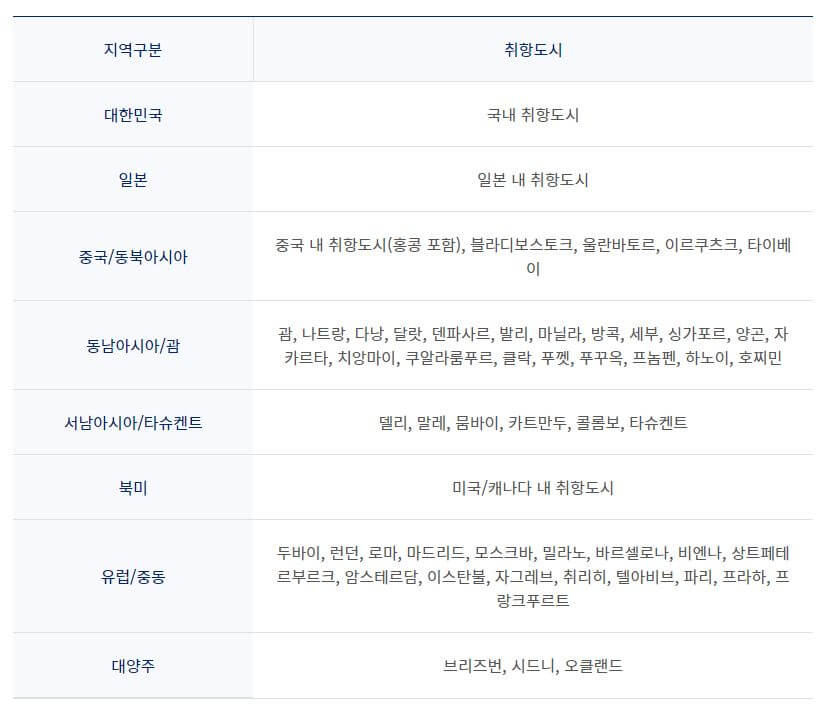 지역구분은 간단합니다. 대륙과 주요 도시에 따라 취항 도시를 나누어두었습니다.